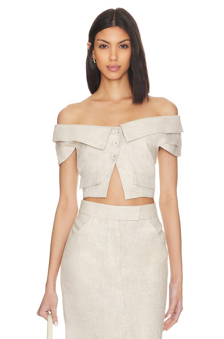 Soft linen fabric and a fitted cropped silhouette combine in this chic Orsina Top, featuring an elegant off-shoulder neckline and delicate cap sleeves. The front button closure and subtle front faux flap pockets add classic charm, while the matte beige hue offers versatile styling options. Ideal for spring and summer occasions, this minimalist top pairs perfectly for casual outings, brunch dates, or vacation wear, bringing effortless sophistication and breathable comfort to your warm-weather wardrobe.