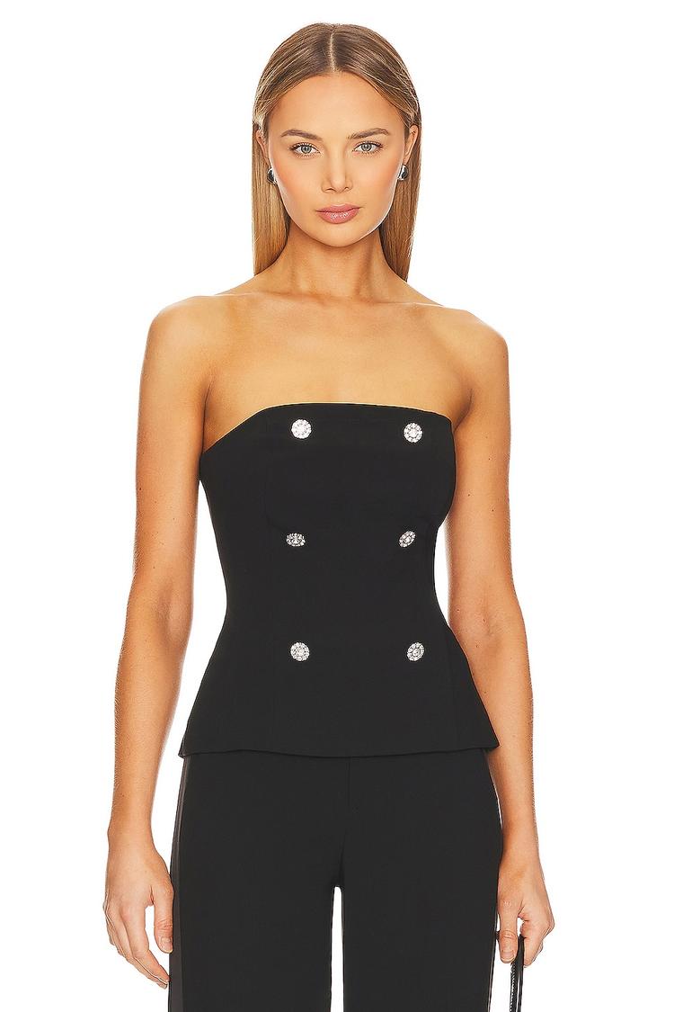 Crystal embellishments add a sparkling touch to this fitted black corset featuring a straight strapless neckline and an exposed back zipper closure. Crafted from a crepe blend of polyester, viscose, and elastane, it offers a sleek silhouette with a hip length cut. Perfect for elevating looks at brunch, date nights, or evening outings, this chic and sophisticated piece blends timeless elegance with modern detailing for versatile wear.