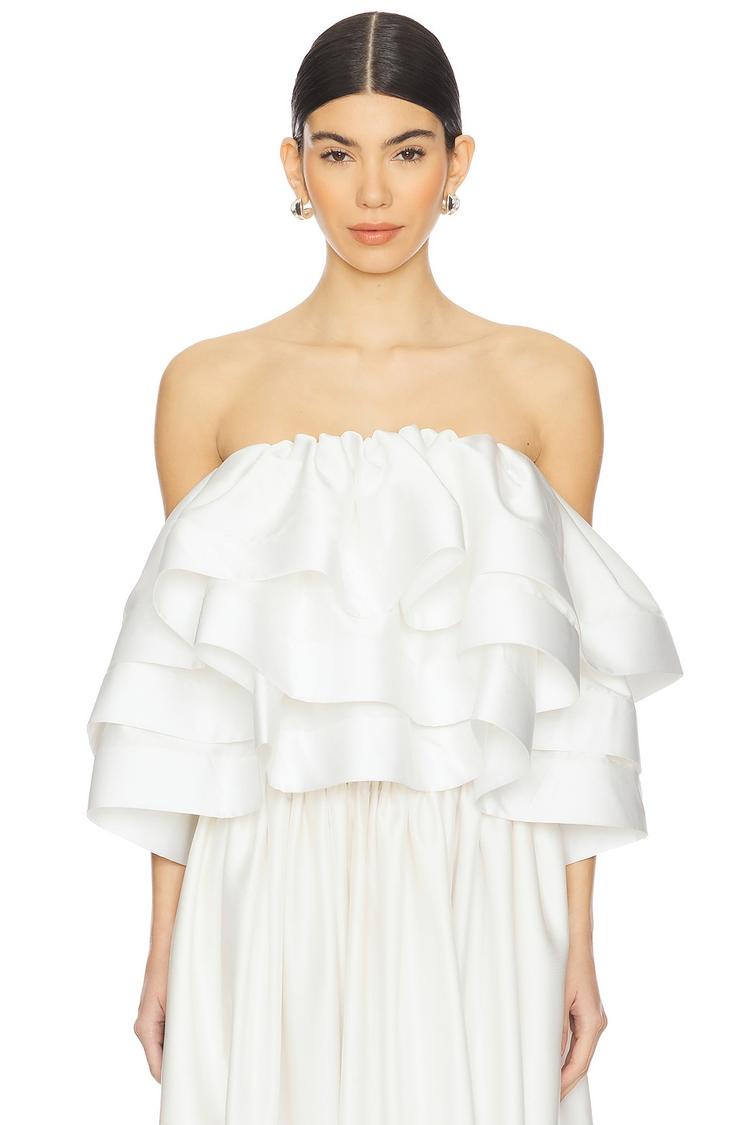 Soft satin fabric with structured hems elevates this strapless, waist-length top featuring elegant ruffles all over. The elastic neckline ensures a comfortable, secure fit while the sleeveless design enhances its romantic and chic vibe. Perfect for spring and summer occasions, this versatile piece is ideal for casual outings, brunch dates, and romantic evenings. Its regular fit and clean white hue provide a timeless look that pairs effortlessly with various bottoms, making it a sophisticated addition to your warm-weather wardrobe.