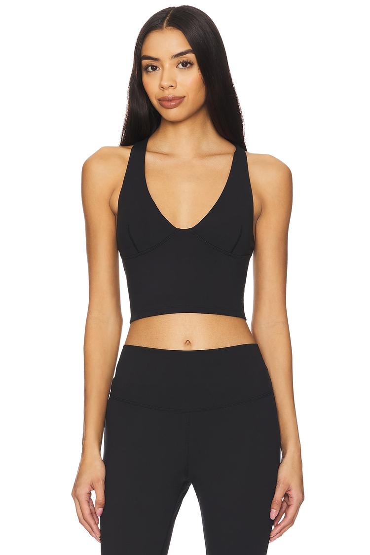 Sleek and fitted, this cropped tank top features a deep V-neck and wide straps that cross elegantly at the back for a bold sporty chic look. Crafted from a stretchy polyester-elastane blend, it offers comfortable wear with a smooth matte black finish. The elastic jersey fabric and detachable padded cups add practicality and shape, making it perfect for workouts, casual outings, or athleisure style. Its streamlined silhouette and minimalist design ensure versatility for all weather seasons and a modern active lifestyle.