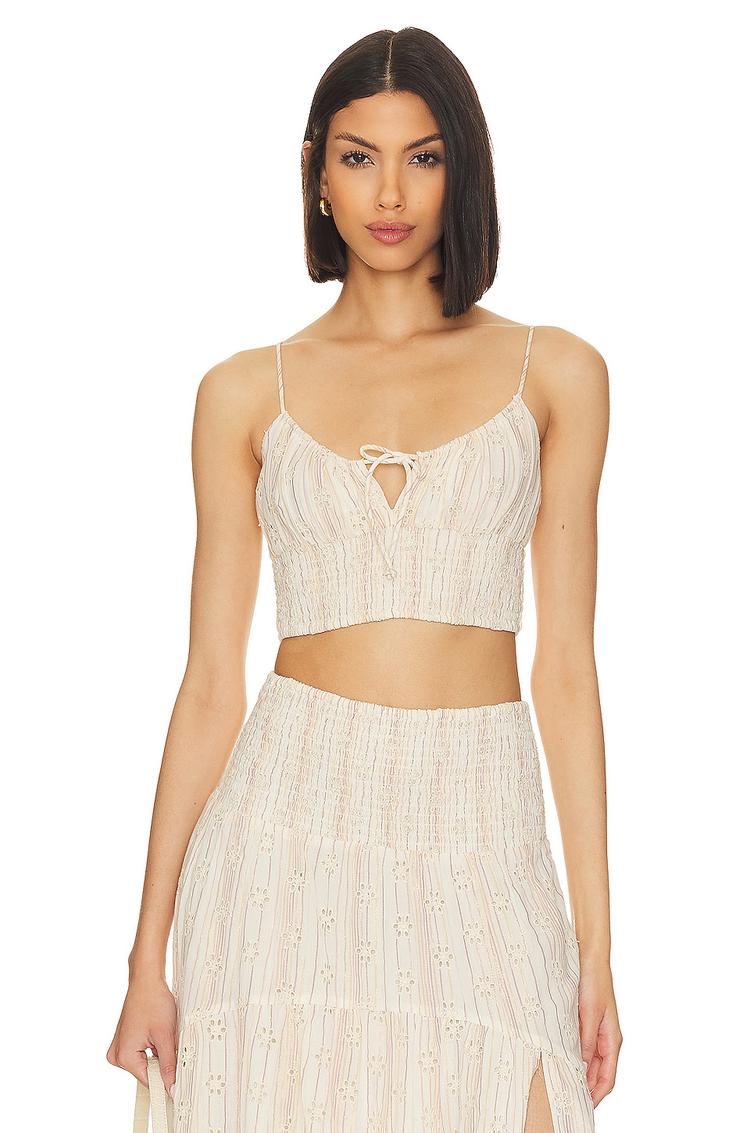 Lightweight eyelet fabric with subtle metallic threading and smocked bodice create a fitted silhouette for this cropped top. Featuring delicate spaghetti straps, a flattering U-neckline, and a playful tie-back closure, this piece embodies casual chic with a bohemian vibe. The cream base color is elevated by metallic silver accents in the smocking and threading, perfect for spring and summer days. Ideal for brunches, casual outings, or vacation wear, this top pairs effortlessly with skirts or high-waisted bottoms for a fresh, stylish look.