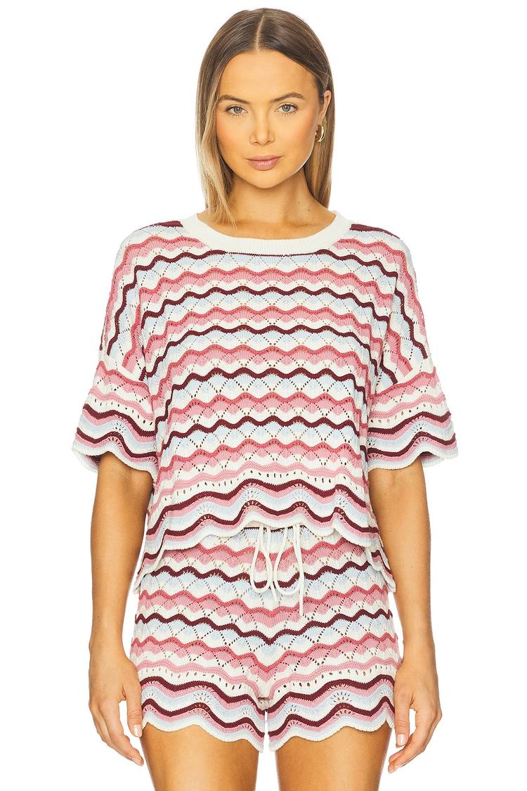 Softly textured lightweight cotton knit defines this loose-fitting shell top featuring half-length flounce sleeves and a round neckline. The hip-length silhouette is enhanced by delicate ruffled hems and an all-over striped pattern in dusty rose, dark red, black, and off-white hues, evoking a relaxed bohemian vibe. Designed with easy pullover styling, it’s perfect for casual days, beach vacations, and laid-back loungewear moments. This breathable and airy top pairs effortlessly with shorts or skirts for a charming spring and summer look.