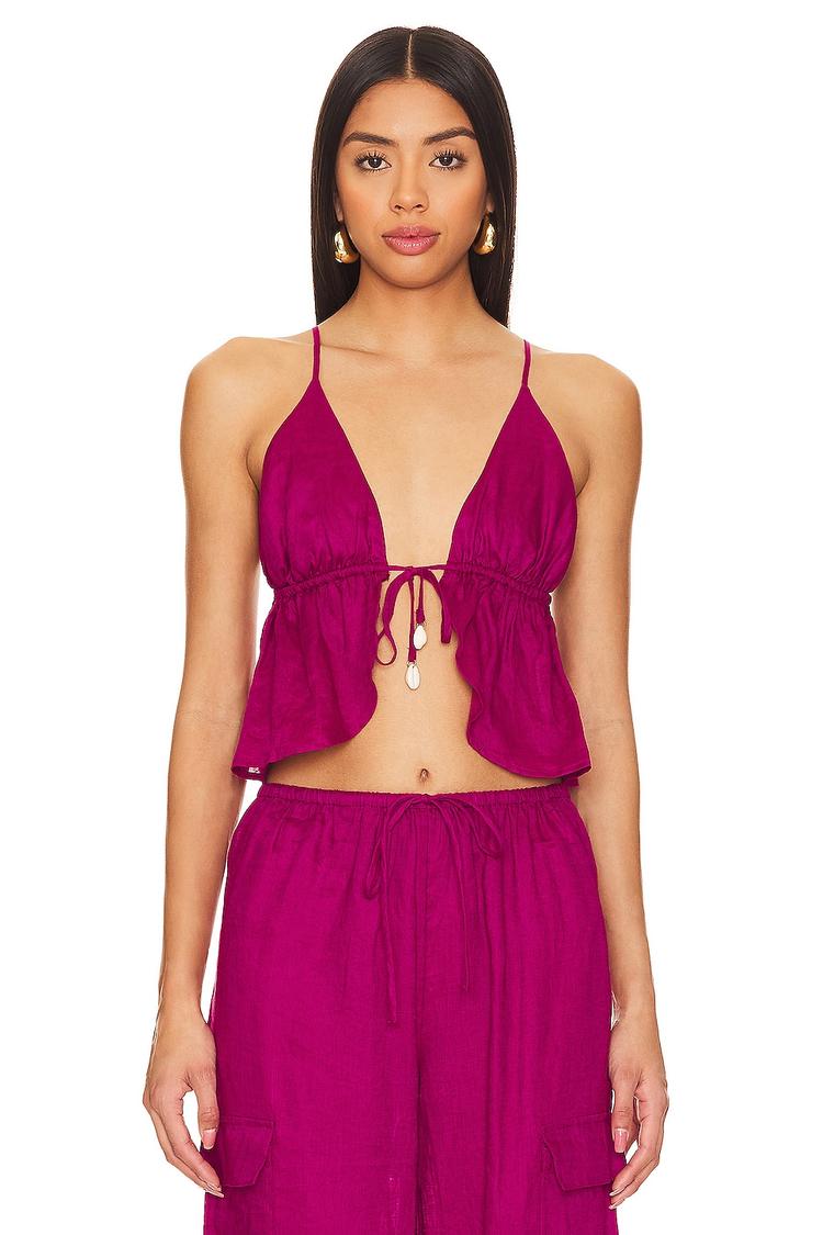 Lightweight linen and a vibrant magenta hue bring this cropped camisole to life, perfect for warm weather days. Featuring a deep V-neck and delicate spaghetti straps, it offers a relaxed fit with a playful ruffled hem that adds charming movement. The drawstring tie closures at the waist and back ensure a customizable fit, enhancing its casual chic and bohemian vibe. Ideal for beach vacations, casual brunches, or date nights, this sundown top blends comfort with style effortlessly for your spring and summer wardrobe.