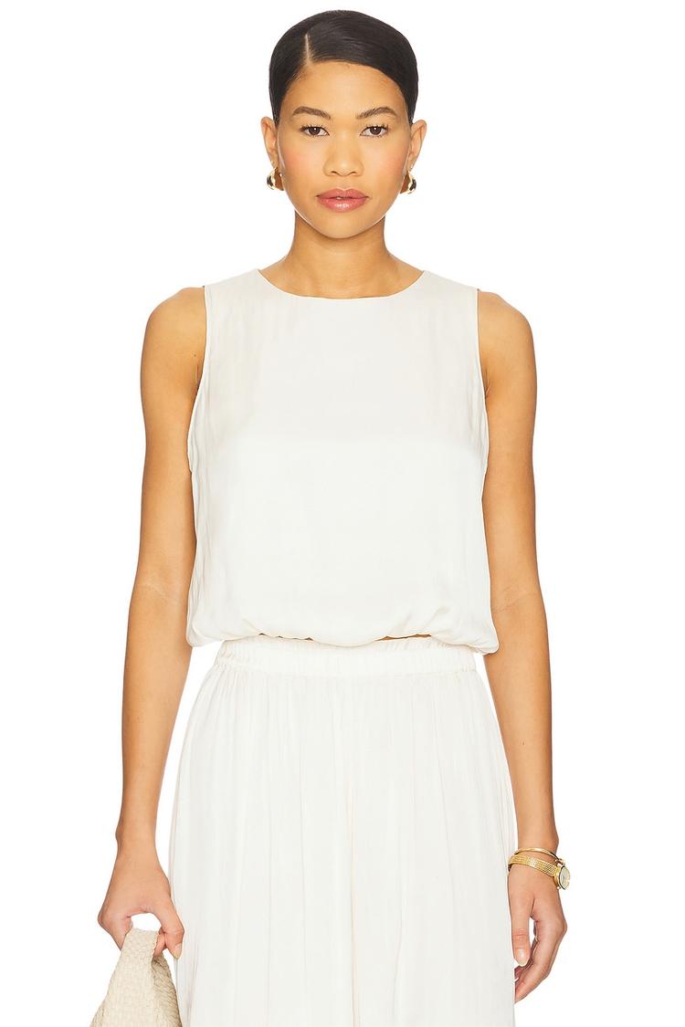 A crisp off-white blouson top crafted from midweight sateen polyester, featuring a round neckline and sleeveless styling for a fresh, airy look. The loose fit with a distinctive bubble hem adds subtle volume and a chic silhouette. Finished with a covered back and a delicate back button loop closure, it balances elegance with minimalist appeal. Ideal for casual outings, brunch dates, and relaxed evenings, this waist-length top offers versatility and understated sophistication for all seasons.