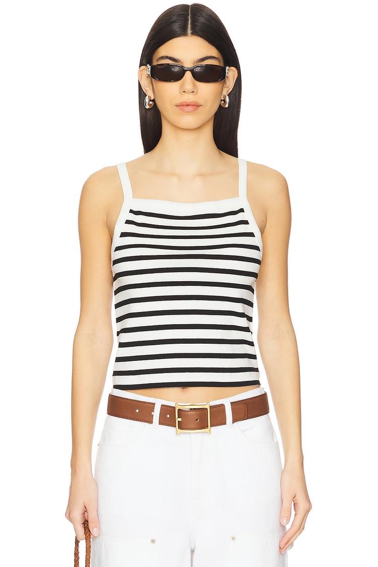 Lightweight cotton fabric and a cropped silhouette combine with a classic striped pattern to deliver a timeless tank top. Featuring a square neckline and wide straps, this slim fit piece is perfect for warm weather layering. Ideal for casual days, brunch outings, or vacation wear, its minimalist and casual chic vibe pairs effortlessly with high-waisted bottoms. The all-over black and white stripes add subtle visual interest while maintaining a clean, versatile look.