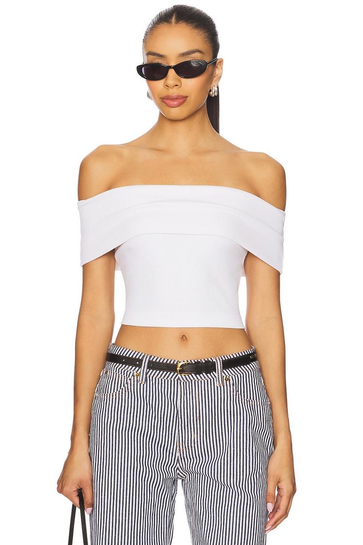 Soft ribbed jersey fabric blends cotton and modal for breathable comfort in this fitted cropped top. The off-shoulder neckline with a fold-over design creates a minimalist and chic silhouette, perfect for spring and summer days. Sleeveless and pullover style ensure ease of wear while the clean white hue complements versatile styling options. Ideal for casual outings, brunch dates, or relaxed date nights, this piece brings understated elegance to your wardrobe.