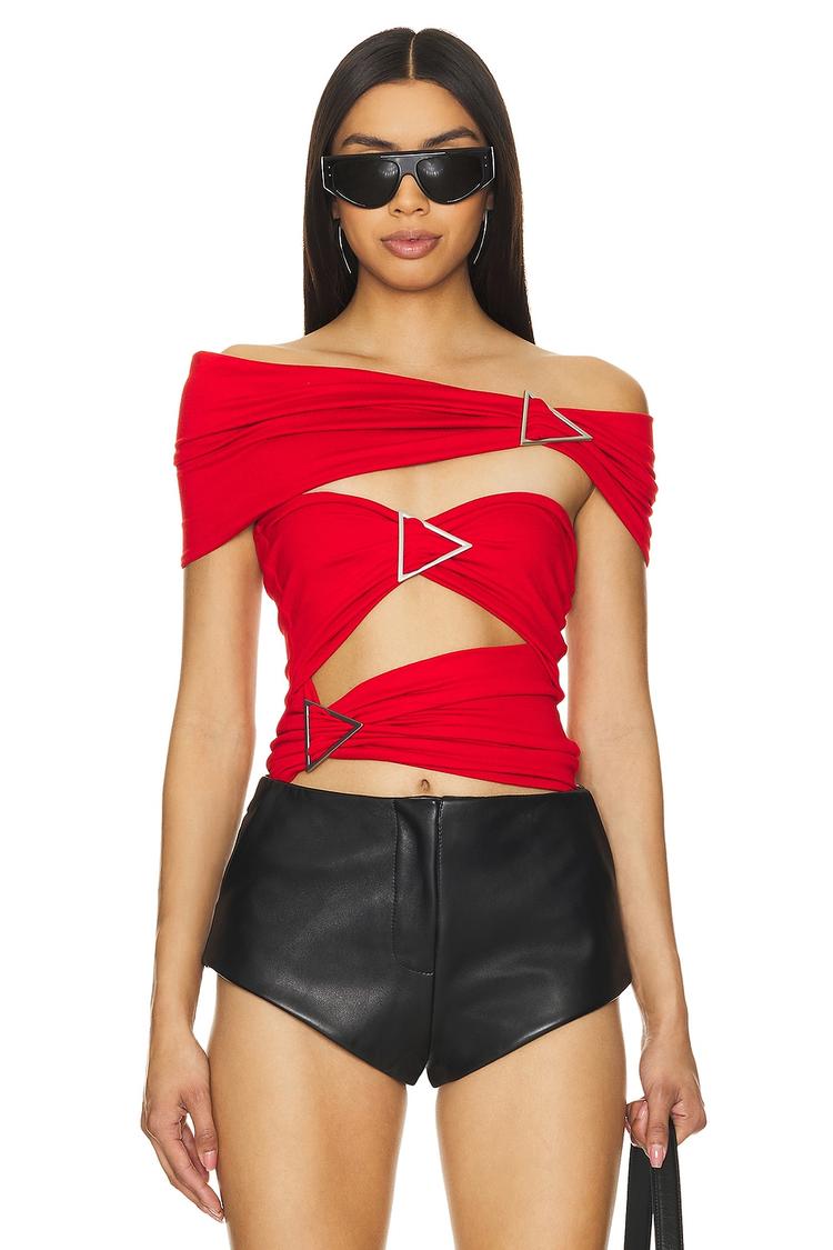 Bold red viscose fabric sculpts this fitted bodysuit featuring an off-shoulder neckline and sleeveless wide straps for a striking silhouette. The cropped length with edgy cut-outs at the front and sides is enhanced by silver buckle details, adding a trendy, sexy vibe. Ideal for summer and spring, this arrow-inspired piece suits casual outings, date nights, and night out events, delivering a confident and chic statement look.