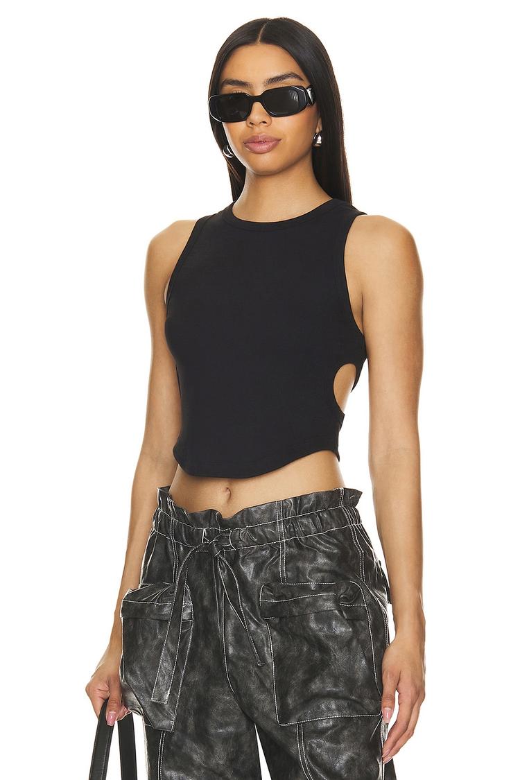 Sleek and fitted, this cropped tank features a classic crew neckline and wide straps crafted from comfortable black jersey fabric. The minimalist silhouette is elevated by stylish side cut-outs, offering a modern twist perfect for spring and summer days. Ideal for casual outings, streetwear looks, and relaxed brunches, this tank pairs effortlessly with high-waisted bottoms. Its pullover design and sleeveless cut provide easy wearability and a flattering fit that complements a variety of styles.