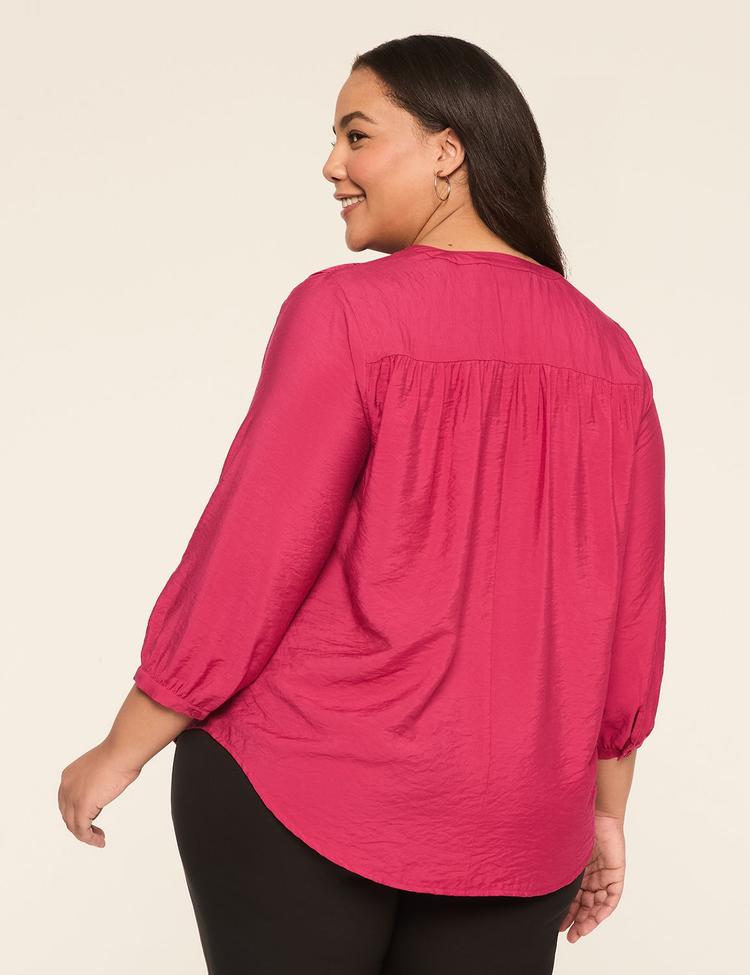 Softly draping in a matte dusty rose rayon-nylon blend, this Plus Size blouson top features a classic crew neck and elegant 3/4 puffed sleeves with button closures. The smocked shoulders add subtle texture, while the high-low hem creates a flattering silhouette that balances comfort and style. Designed with a regular fit, this high-low length button-front top is perfect for casual outings, business casual settings, and weekend brunches, offering versatility and a polished look for multiple occasions.