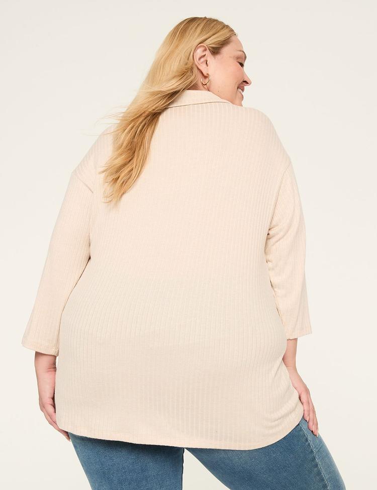Soft, stretchy ribbed knit fabric and a classic polo silhouette define this 3/4-sleeve plus size top in a versatile oatmeal hue. Featuring a flattering V-neck with a polo collar and a regular fit, this hip-length piece offers comfort and style for workwear, casual outings, or lounging at home. Its timeless design and breathable fabric blend make it a dependable choice for all seasons and occasions, easily paired with jeans, polished pants, or leggings for effortless versatility.