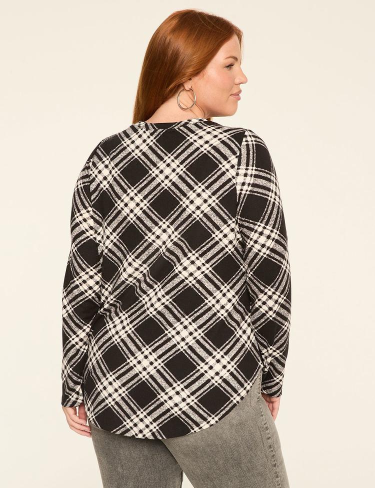 Soft spun polyester knit in a classic black and white checkered pattern defines this plus size shell with a crew neck and long, regular sleeves. The hip-length silhouette features a curved high-low hem that offers a flattering and comfortable fit, perfect for everyday wear. Designed with a regular fit, this top transitions seamlessly from workwear to casual brunches or business casual settings, delivering both style and comfort throughout autumn and winter seasons.