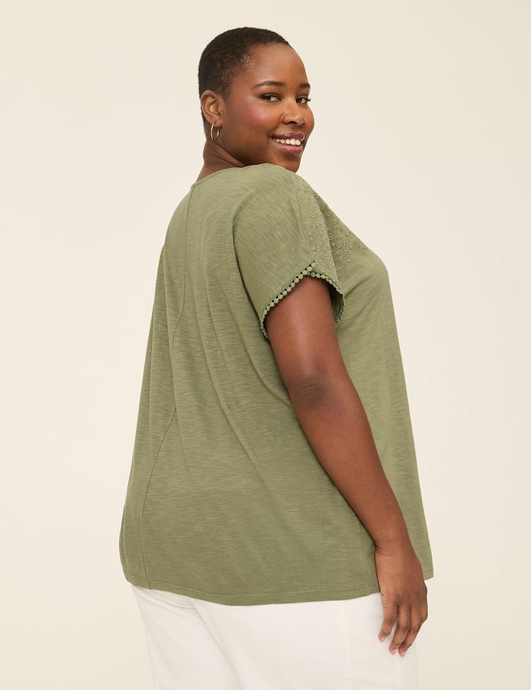 Soft, breathable cotton-modal blend and a relaxed swing fit create an effortlessly polished plus size top. Featuring classic crew neck and airy half dolman sleeves, this hip-length piece is detailed with delicate eyelet embroidery at the neckline and sleeves for subtle texture. Its matte olive hue makes it versatile for casual days, workwear, or business casual settings, ensuring comfort and style throughout spring and summer seasons.