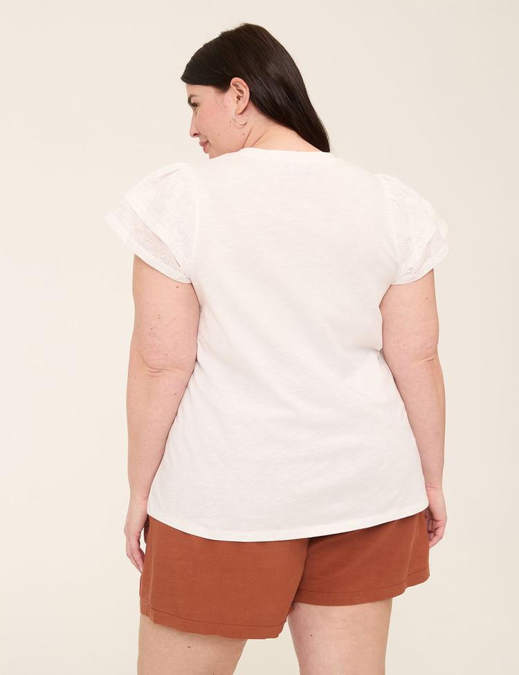 Soft cotton knit meets delicate eyelet embroidery in this classic shell top, designed with flutter half sleeves and pintuck pleats for a flattering, regular fit. The V-neckline and hip-length silhouette offer a versatile look perfect for casual weekends, workwear, or weekend brunches. Crafted for plus sizes, this breathable and lightweight top blends woven and knit fabrics for comfort and style in warmer seasons.