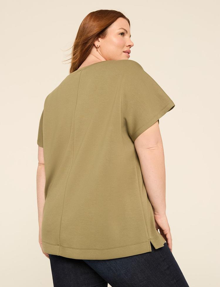 Luxuriously soft modal blend fabric with a relaxed swing fit creates effortless comfort in this plus size top. Featuring a classic crew neck and chic dolman half sleeves, the olive hue adds an earthy, versatile vibe. Shirring at the shoulders enhances subtle texture while side slits at the hip-length hem ensure ease of movement. Wrinkle-resistant and with 4-way stretch, this top is perfect for casual days, loungewear moments, or everyday wear with a casual chic style.