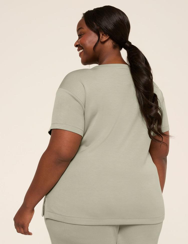 Soft, drapey fabric with 4-way stretch defines this plus size V-neck shell top, designed in a matte sage hue that offers easy styling for all seasons. Featuring cuffed half sleeves and side slits at the hem, it ensures comfort and mobility with a classic covered back and a relaxed, comfort fit. Its wrinkle-resistant Journey fabric transitions seamlessly from workouts to travel and casual loungewear, making it an essential versatile piece for everyday comfort and casual chic looks.