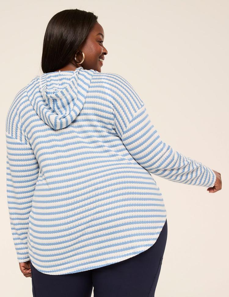 Soft, airy cotton fabric and a relaxed comfort fit define this plus size striped hoodie. Featuring a hooded neckline and long sleeves, its hip-length silhouette is perfect for casual weekend errands, low-key lounging, or travel days. The classic blue and white stripes add a timeless pattern, while the pullover style ensures easy wear. Designed to flatter curves with a just-right fit, this versatile top pairs effortlessly with jeans or leggings for a cozy, casual chic look ideal for cooler seasons.
