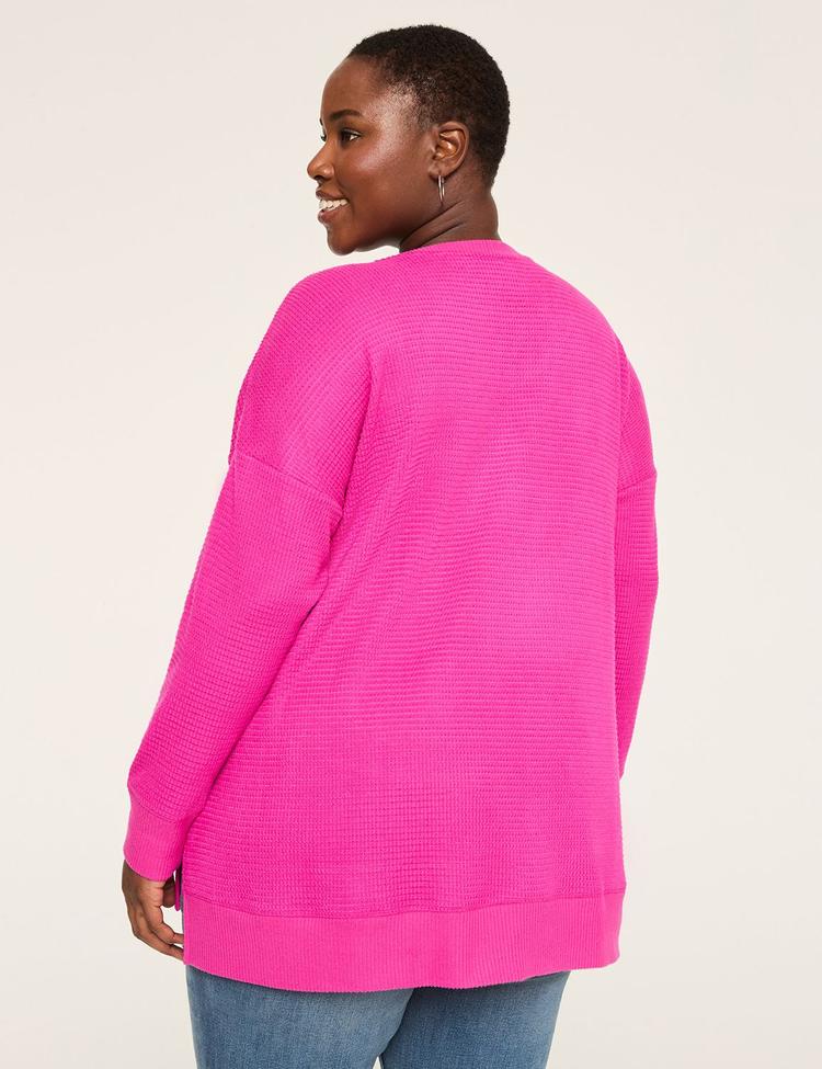 Available in Plus Size Top trends of the season include this V-Neck Waffle tee. Plush texture, dress-up-or-down possibilities. FIT: Classic. Designed for curves and a not-too-tight, not-too-loose, just-right fit. Front Length (On Body): 32" Back Length (On Body): 33.5" Longer length is perfect for added coverage FEATURES: V-neck Long sleeves Ribbed trim Side slits at high-low hem for ease and movement FABRIC: Cloud-soft, plush-textured waffle knit with the perfect amount of stretch Machine Wash Cold With Like Colors; Gentle Cycle; Only Non-Chlorine Bleach When Needed; Tumble Dry Low; Cool Iron If Needed 95% Polyester/5% Spandex Item Number #413752 Imported Plus Size Top ". Plus Size Long-Sleeve V-Neck Waffle Knit Top, in Bright Pink, 14/16, Women's, Lane Bryant