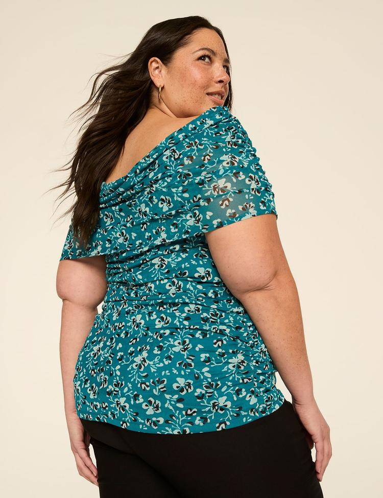 Soft mesh fabric and a classic fit bring effortless elegance to this plus size off-the-shoulder shell top. Featuring a hip length silhouette with delicate floral prints in matte teal accented by black and white, the side ruching adds a flattering touch to the design. Sleeveless with an off-shoulder neckline, this smock-style top is perfect for casual days, workwear, or business casual events. Its sheer panels and comfortable stretch blend of polyester and spandex make it a versatile piece for spring through autumn occasions like brunch, date nights, or night outs.
