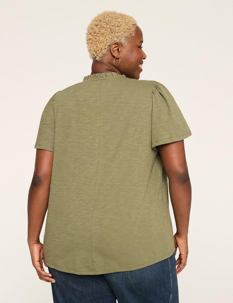 Soft cotton slub knit and delicate pintuck detailing shape this plus size smock top with a classic fit. The crew neck features a charming ruffle trim, complemented by a button placket and gentle smocking at the yoke for subtle texture. Its short regular sleeves and hip length hem make it a versatile piece ideal for casual weekends, polished office looks, or business casual settings. Comfortable and stylish, this olive-hued top embraces both ease and elegance, perfect for all seasons and occasions where effortless sophistication is key.