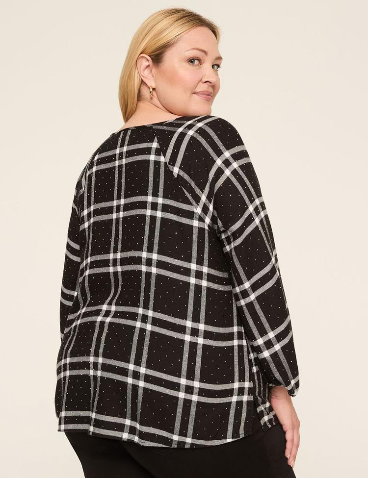 Classic black plaid with subtle rhinestone embellishments adds a touch of sparkle to this plus size top. Featuring a split neckline with a delicate tie-up detail and cuffed bracelet-length sleeves, it offers a flattering regular fit designed for curves. Crafted from a stretchy rayon-polyester twill fabric, the top maintains structure while ensuring comfort. Its hip length and covered back make it versatile for casual, business casual, and everyday workwear looks during autumn and winter seasons.