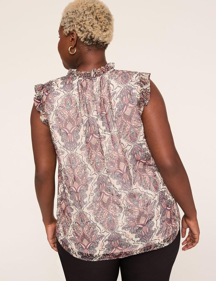 Soft, airy chiffon and delicate ruffles define this plus size tank top, featuring a classic split neck with a subtle tie-up detail. The sleeveless silhouette and hip-length cut provide a comfortable regular fit, making it ideal for spring and summer days. The ivory base is beautifully adorned with a muted paisley print and shimmering sequins that add just the right touch of sparkle. Perfect for casual outings, everyday wear, or brunch dates, this top combines timeless style with effortless comfort in a plus size tailored fit.