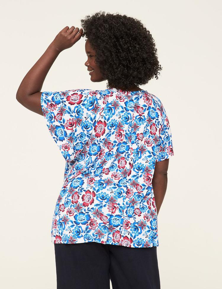 Soft rayon-spandex knit fabric combines with shirred flutter sleeves to create a comfortable yet stylish swing top. Featuring a classic crew neck and a relaxed regular fit, this plus size hip length top is adorned with an Americana floral print in vibrant blue and red hues on a crisp white base. Ideal for casual chic looks, it easily transitions across all seasons and occasions like workwear, brunch, and travel. The smocked detail on the sleeves adds subtle texture, making it a versatile piece for everyday wear.