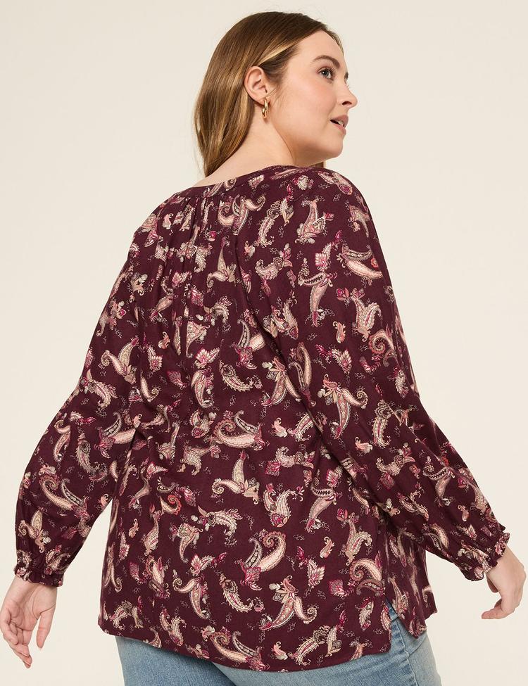 Cozy-soft flannel in a rich burgundy paisley print defines this plus size swing top, designed for effortless comfort and style. Featuring a split neckline and long bishop sleeves with ruffled elastic cuffs, the hip-length silhouette offers a loose fit that flatters curves gracefully. Side slits at the hem enhance movement and ease, making it an ideal choice for casual days, workwear, or weekend brunches. This versatile top blends classic charm with cozy warmth for autumn and winter seasons.
