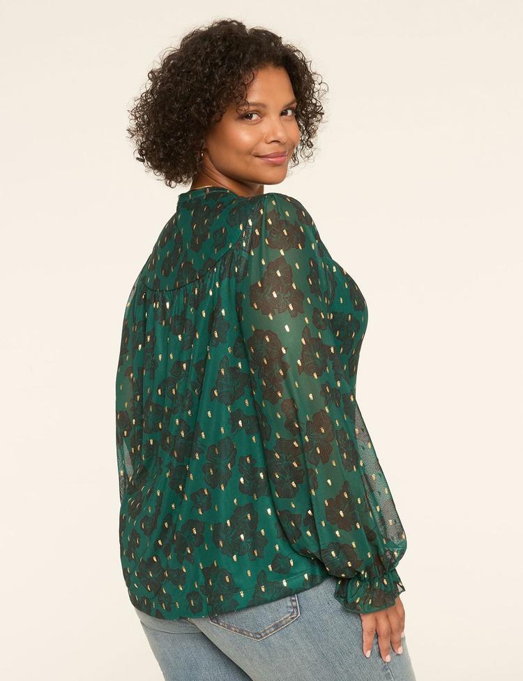 Soft sheer mesh and a flowy swing fit define this plus size top, featuring a chic mock neck with a tie-up detail. The long sleeves end in elastic ruffle cuffs, adding a feminine touch to the hip-length silhouette. Adorned with a green floral print and shimmering gold accents, this elegant piece pairs perfectly with jeans for casual days or a twirly skirt for festive occasions. Ideal for brunch, casual outings, or workwear, it offers both style and comfort in a sophisticated design.
