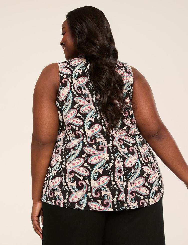 Subtle sophistication meets comfort in this plus size twist-neck tank top crafted from matte polyester-spandex jersey knit. Featuring a sleeveless silhouette with a distinctive twist neckline, this hip-length classic fit top is adorned with an all-over paisley print in soft dusty rose, dusty blue, and white on a matte black base. Ideal for casual, everyday wear or relaxed brunch outings, it offers a flattering regular fit with just the right coverage. Easy to style and comfortable to wear, it’s a versatile addition to your warm-weather wardrobe.