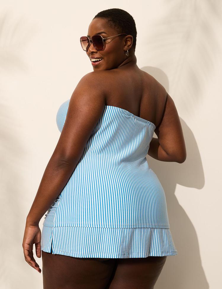Soft matte white and blue striped seersucker fabric enhances this fitted tank top with a sweetheart neckline and spaghetti straps, offering a flattering, ruched silhouette that smooths and shapes. Designed for plus sizes, it features underwire support with a secure hook-and-eye closure and adjustable, removable straps for versatile styling. The silicone edge ensures a no-slip fit, making it perfect for beach days, poolside lounging, and summer vacations. This eco-friendly tankini combines intimate-inspired design with superior comfort and curve-enhancing details for confident, all-day wear.