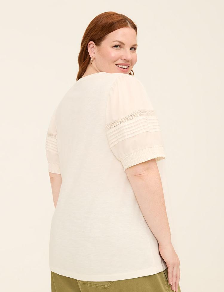 Soft, breathable cotton knit meets classic design in this plus size shell top featuring a flattering notch neck and half-length puffed sleeves with elegant smocked trim details. Its regular fit and hip-length silhouette make it a versatile choice for casual days, workwear, and business casual settings. The smooth woven sleeves add subtle texture contrast, ensuring a polished look that pairs effortlessly with denim or tailored pants for three-season wear.