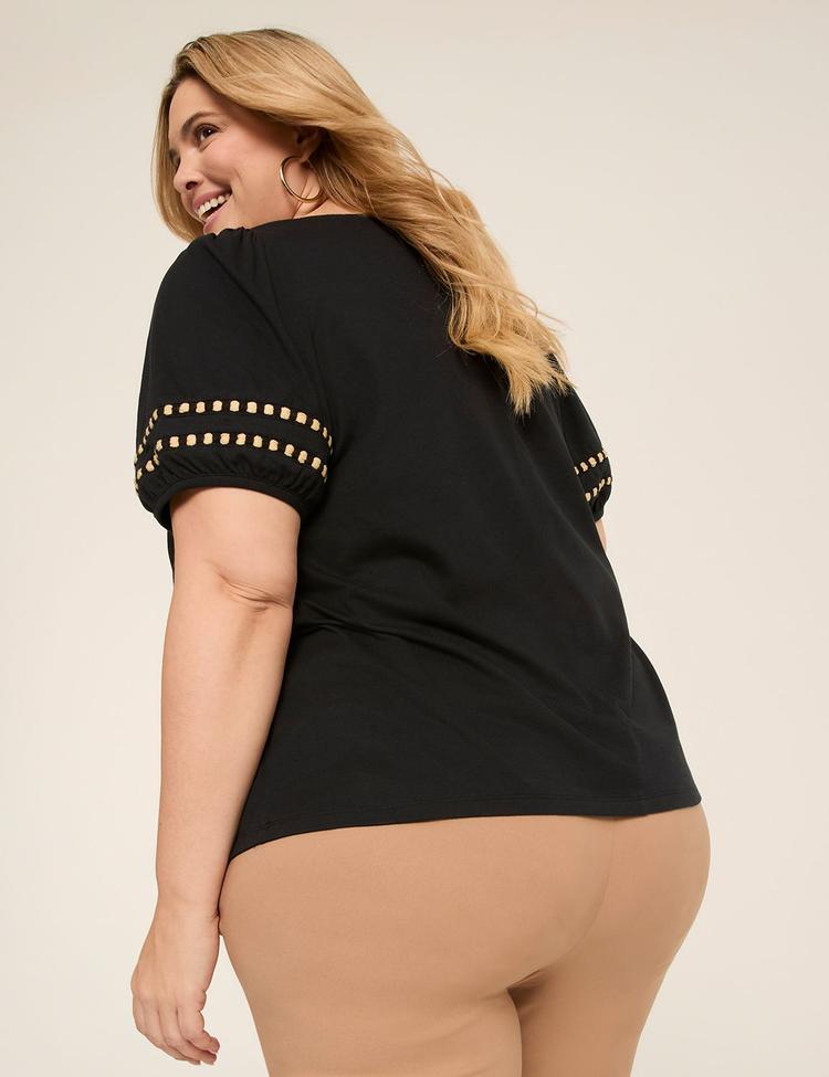 Soft, breathable jersey knit and a classic boat neckline define this plus size top, designed for a comfortable, just-right fit. The short puffed sleeves with chic trim detail add a subtle statement to the hip-length silhouette, making it ideal for spring, summer, and autumn wear. Perfect for casual outings, workwear, and business casual settings, this black top pairs effortlessly with tailored pants or jeans, blending elegance with everyday versatility.