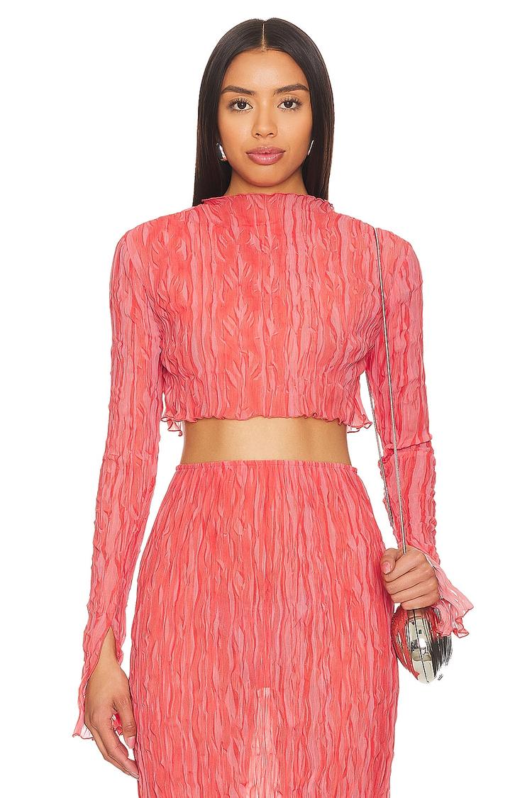 Soft pleated georgette fabric in a striking matte coral hue defines this cropped top with a fitted silhouette. Featuring a high neck and long regular sleeves, it offers a modern and elegant appeal. The concealed back zipper ensures a seamless finish, while the all-over pleated texture adds dimension and sophistication. Ideal for casual outings, brunch dates, or night outs, this versatile piece combines style and comfort effortlessly.
