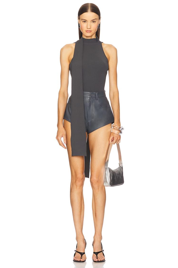 A sleek matte black halter neck tank top crafted from a midweight viscose-polyester jersey blend offers a slim, hip-length silhouette. Featuring wide straps and a distinctive attached draped scarf accent at the front, it adds modern sophistication and subtle draping detail. Its pullover design ensures effortless wear, making it an ideal choice for casual outings, night outs, or date nights. This chic top pairs perfectly with tailored trousers or leather shorts for a confident, contemporary look.