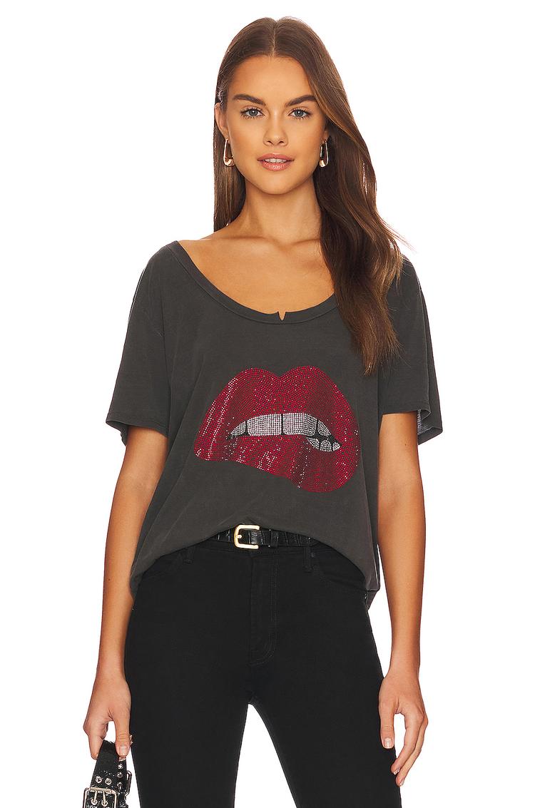 Soft lyocell and cotton blend fabric lend a comfortable, breathable feel to this relaxed-fit shell top. The hip-length silhouette features a raw-cut hem and an intentionally split U-neckline for an edgy touch. Half-length regular sleeves and a covered back enhance its casual chic vibe. A striking crystal-embellished biting lip graphic adorns the front, adding a bold statement perfect for everyday wear, brunch dates, or street style outings. Easy to style and machine washable, this versatile black top makes a standout addition to any casual wardrobe.