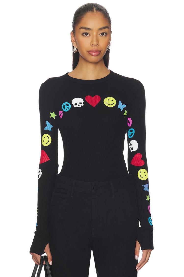 Lightweight waffle-knit fabric and a fitted silhouette bring comfort and style to this long-sleeve thermal top. The matte black base is energized by a vibrant graphic arch of colorful symbols across the front and sleeves, creating a trendy, casual chic look. Featuring a classic crew neckline and hip-length cut, this pullover is perfect for everyday wear, casual outings, and streetwear vibes during cooler spring, autumn, or winter days.