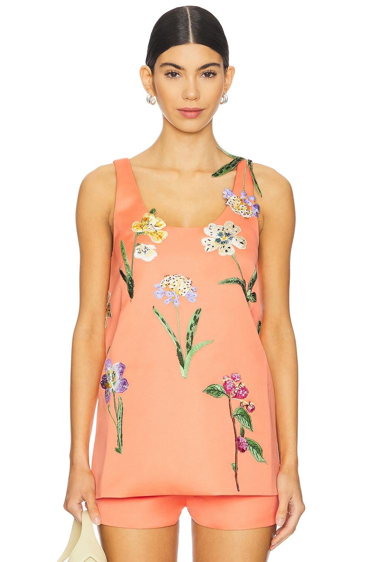 Soft matte coral crepe fabric combines with delicate allover floral embroidery and beaded detailing to create a romantic sleeveless tank top. The loose fit and square neckline enhance comfort and style, while wide straps provide subtle support. Perfect for spring and summer casual outings, brunches, or everyday wear, this hip-length top adds a fresh, modern touch to your wardrobe with its intricate floral accents and easy pullover design.