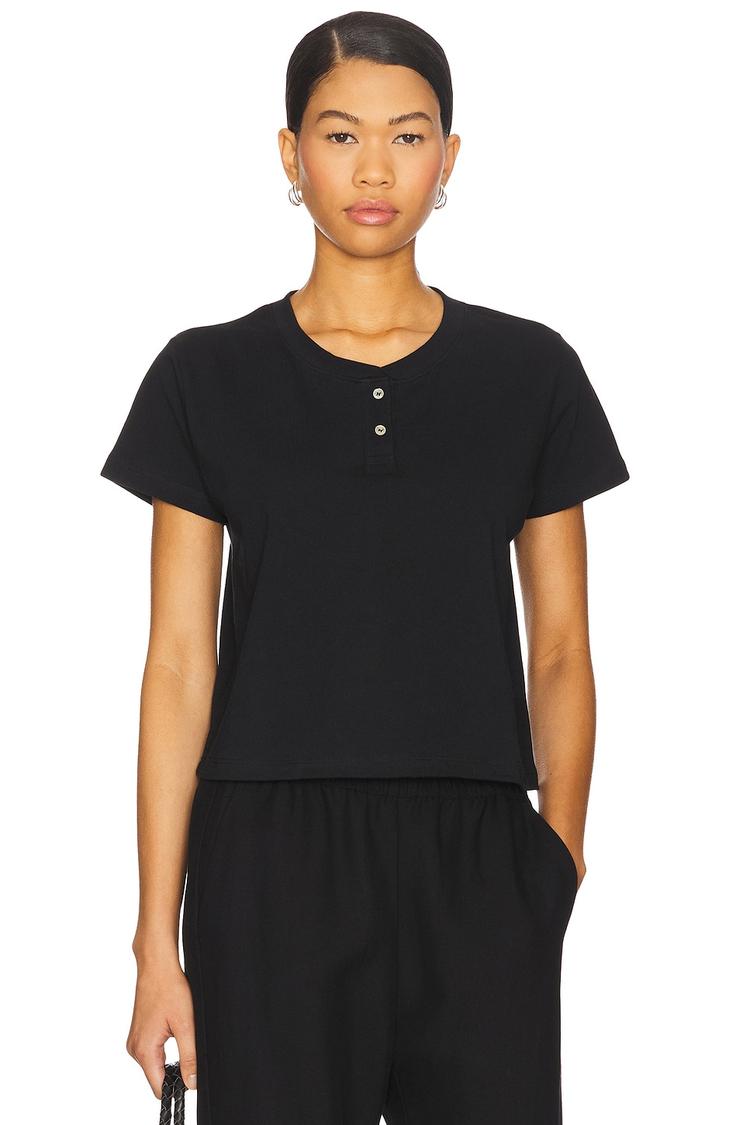 Crisp cotton fabric and a boxy, cropped silhouette combine in this Henley top for a relaxed yet structured look. Featuring a classic henley neckline with a front partial button placket and half-length regular sleeves, it offers easy styling for casual, everyday wear, travel, or laid-back outings. The matte black hue underscores its minimalist, casual chic aesthetic, making it a versatile piece ideal for spring through autumn. Pair with high-waisted bottoms to accentuate its cropped length and enjoy breathable comfort in this midweight jersey cotton top crafted in the USA.
