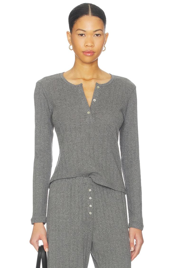 Midweight pointelle cotton fabric shapes this slim-fit Henley top featuring a classic V-neck with a front partial button closure. Its long sleeves and hip-length silhouette provide versatile coverage, making it an ideal choice for casual outings, loungewear, or travel days. The minimalist gray tone and subtle texture bring a refined yet relaxed vibe, perfect for everyday wear or layering under jackets for business casual settings.