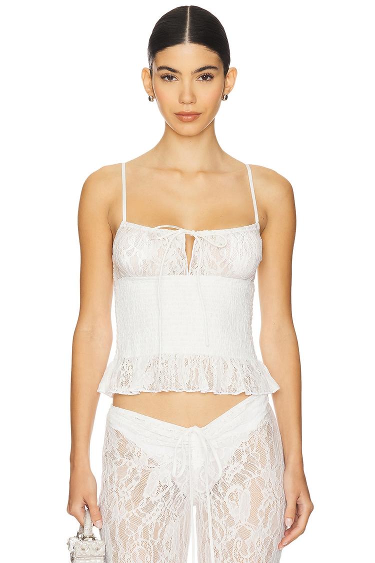 Delicate lace with a slim fit and adjustable spaghetti straps defines this chic camisole. Featuring a straight neckline with a charming bow closure at the front and ruffled trim along the hem, this waist-length top combines sensuality with romantic details. Crafted from a midweight nylon and elastane blend, it offers a sheer texture perfect for layering or making a statement. Ideal for casual outings, brunch dates, or intimate evenings, this piece brings a sophisticated yet playful edge to your warm-weather wardrobe.