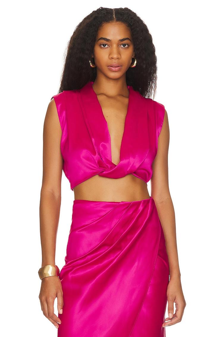 Turn heads in a bold pink satin moment. The Lisa Top features a plunging V-neck, a sleeveless silhouette, and a front twist that creates a chic draped hem in a cropped length. Crafted from satin that catches the light with a soft, glossy finish (95% polyester, 5% elastane for a subtle stretch), it has an elastic back hem for a secure, flattering fit. The look is elegant and chic, ideal for cocktail evenings, date nights, or a glam night out with friends. Dress it up with a high-waisted skirt or pants and strappy heels for instant party-ready allure.