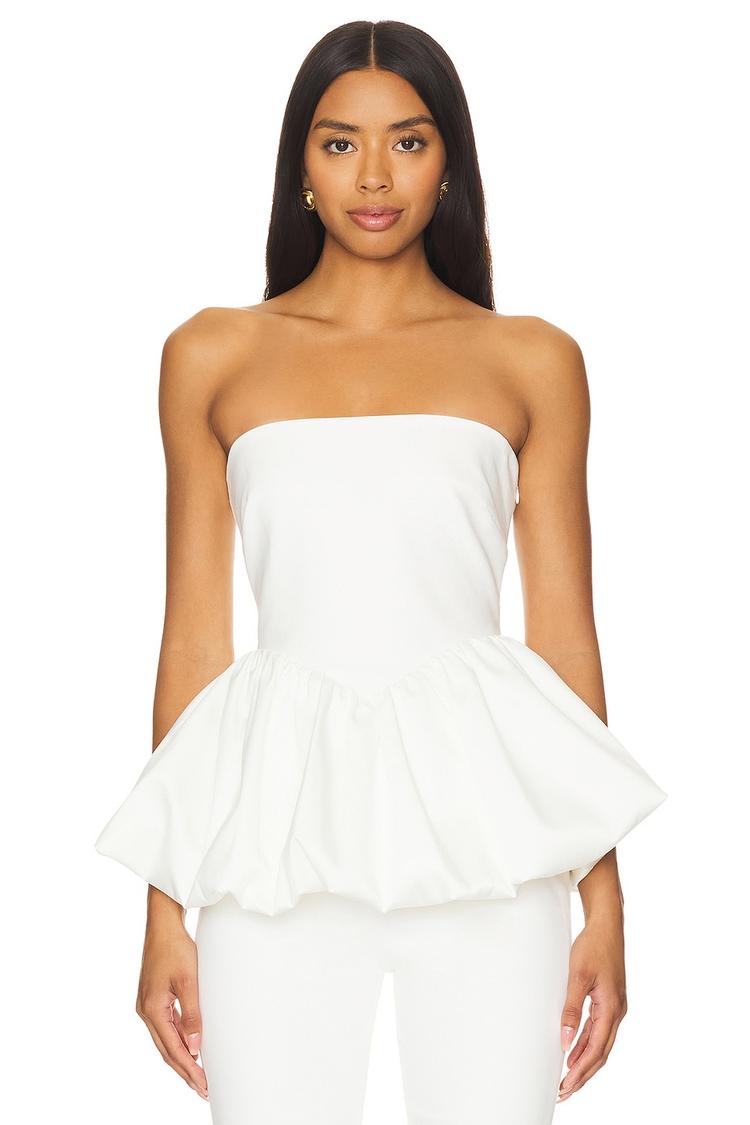 A strapless silhouette with a chic peplum hem, this fitted Bandeau top in crisp white crepe fabric offers a clean and elegant look. The hidden side zipper closure ensures a smooth, flattering fit around the waist length hemline. Ideal for spring and summer outings, this modern top brings a polished edge to brunches, casual dates, or night outs, combining sophisticated style with wearable comfort.