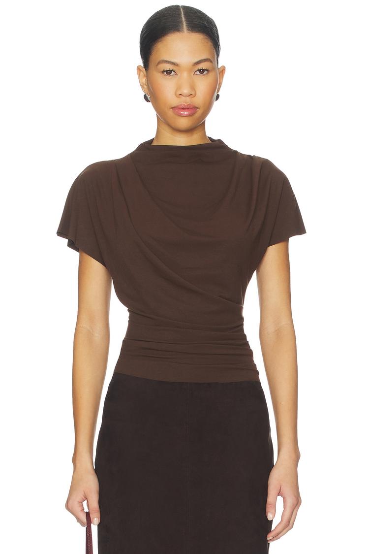 Soft matte brown viscose with a hint of stretch defines this fitted shell top featuring a high neckline and short sleeves. The ruched front and darted waist create a flattering silhouette that pairs effortlessly with business casual or casual ensembles. Ideal for spring through autumn, its minimalist and sophisticated style suits workwear, business casual, and relaxed weekend occasions. A pullover design makes it easy to wear, while the subtle ruffle detail adds a touch of elegance without overpowering the look.