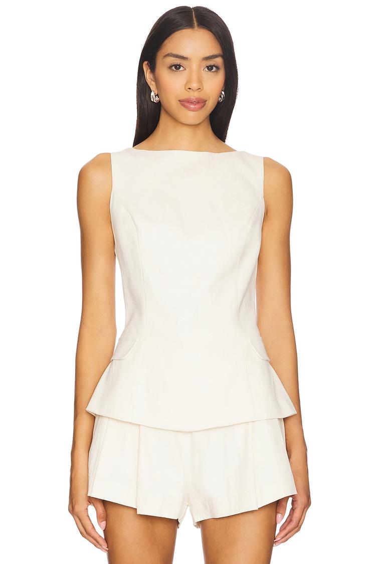 Clean lines and a structured peplum silhouette define this fitted off-white cotton top. The sleeveless design with a classic boat neckline creates a minimalist yet chic look, while the concealed back zipper with hook and eye closure ensures a seamless finish. Midweight fabric lends a polished feel, making it perfect for casual outings, brunch dates, or polished workwear and business casual settings. The faux flap pockets add subtle detailing that complements the tailored shape, offering versatile style with a timeless appeal for spring and summer seasons.
