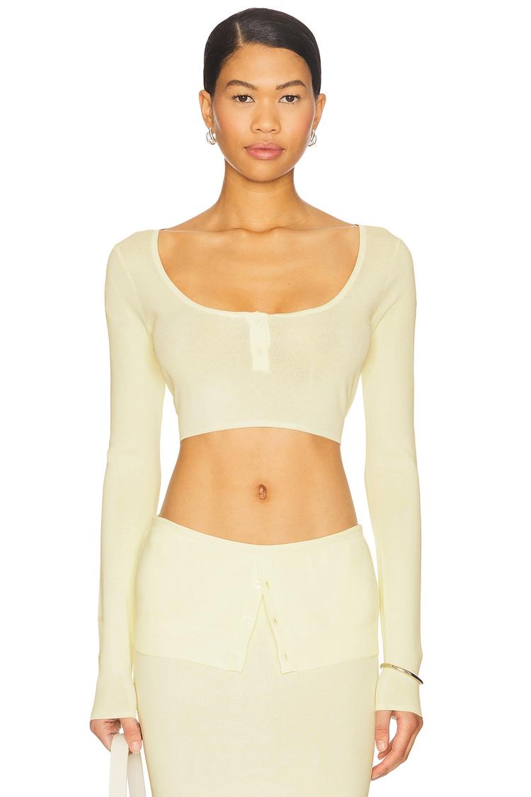 Soft matte beige and a slim fit define this cropped top crafted from a midweight ponte fabric blend of viscose and nylon. Featuring a scoop neckline and long regular sleeves, it is finished with a subtle front partial button placket for understated detail. This minimalist modern piece suits spring and autumn wear and easily transitions between casual outings, brunch dates, and night out events with its chic silhouette and comfortable fabric.