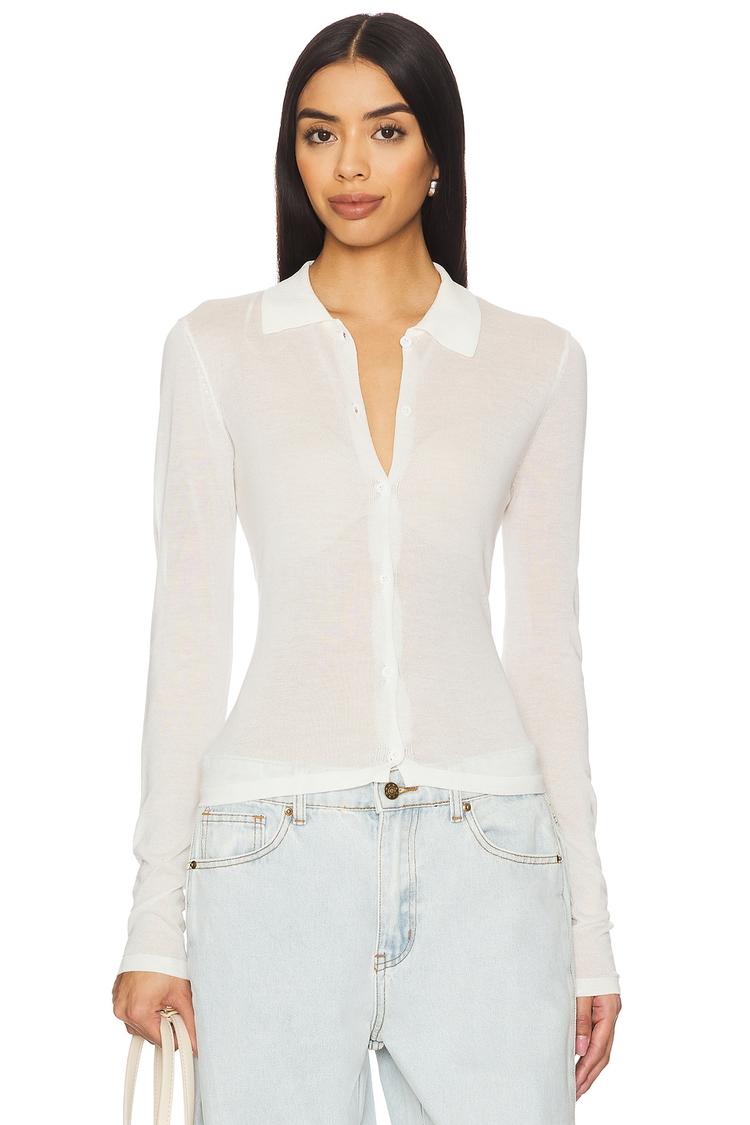 Lightweight knit fabric and a semi-sheer finish define this fitted shell with long sleeves and a classic collar. The hip-length silhouette and front button closure add to its minimalist elegance, perfect for casual outings, workwear, or brunch dates. Crafted from a blend of viscose and lyocell, this breathable top offers refined comfort and a subtle transparency that pairs well with layered looks for spring and autumn wear.
