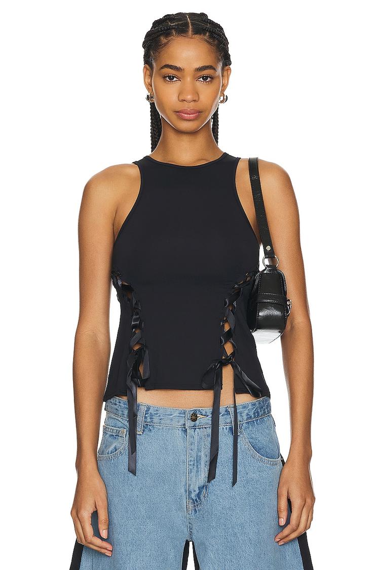 A sleek black tank top crafted from a nylon-elastane blend offers a fitted silhouette enhanced by unique front and back lace-up details. Featuring a crew neckline and sleeveless styling with strap-like shoulder straps, this waist-length pullover combines modern edge and street style sophistication. Ideal for warm weather, it's versatile for casual outings, streetwear looks, and stylish brunches. The lace-up accents add a striking design element while maintaining comfort with its stretchy fabric, making it a standout piece for effortless everyday chic.