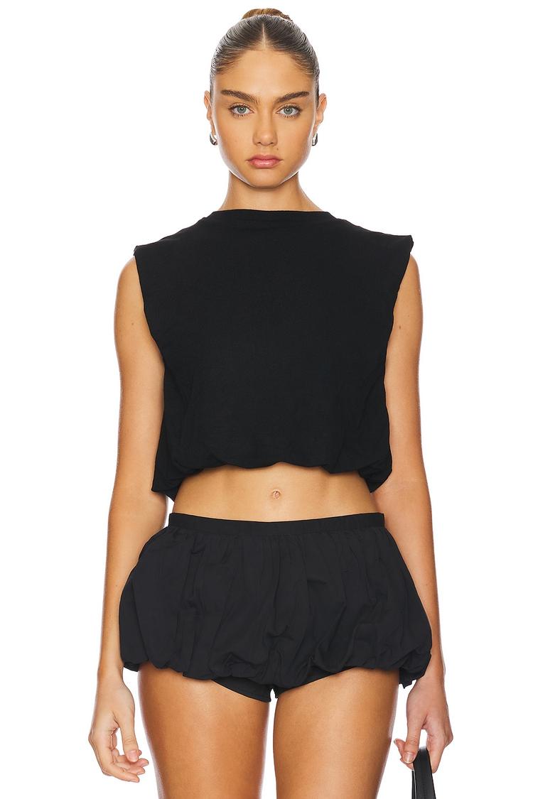 Effortless and chic, this cropped top features a relaxed fit with wide straps and a classic crew neckline. Crafted from a soft blend of viscose, polyester, and elastane, it offers breathable comfort and slight stretch. The sleeveless design and matte black hue make it a versatile piece perfect for casual outings, brunch dates, and streetwear looks during spring and summer. Its minimalistic silhouette and covered back deliver understated style that pairs seamlessly with high-waisted shorts or skirts for a modern, laid-back vibe.
