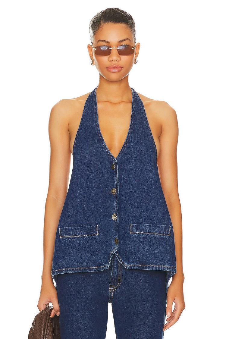 Denim-inspired cotton fabric shapes this halter neck tank top with a plunging neckline and sleeveless design for warm weather wear. Featuring a loose fit and hip length silhouette, the front button closure and back tie-up add subtle functional details. Its solid matte dark blue hue and casual chic vibe make it a versatile piece for casual outings, brunch dates, or streetwear ensembles during spring and summer seasons.