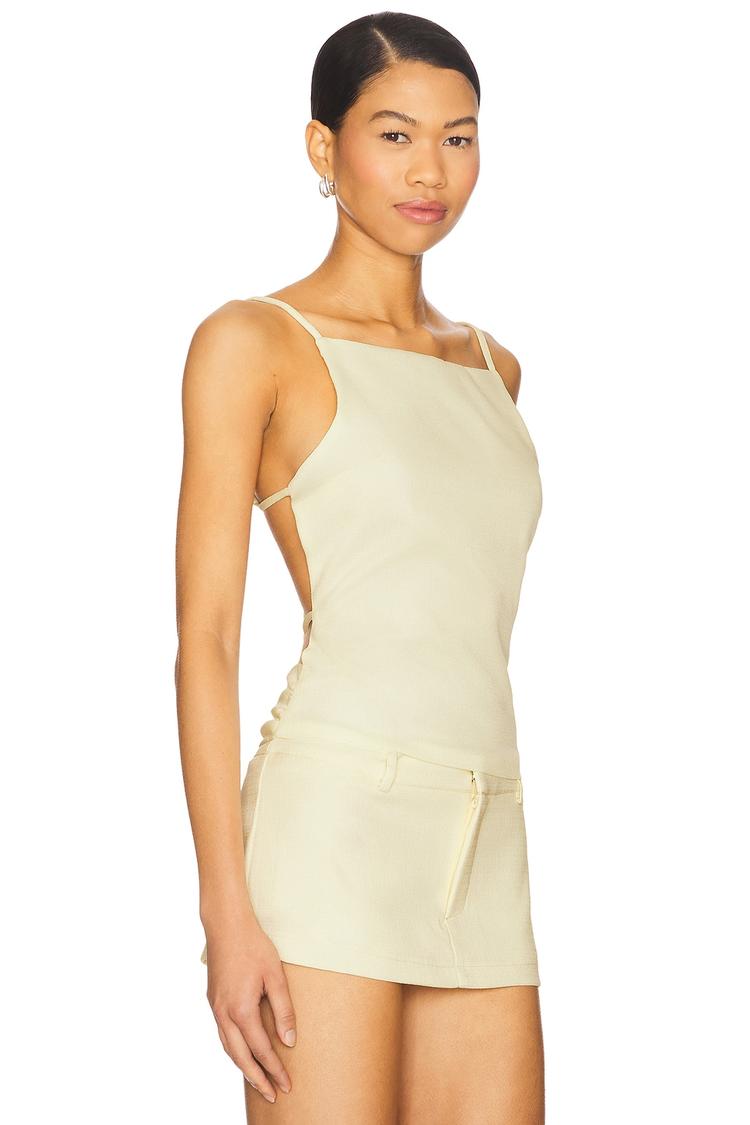 Clean lines and a modern square neckline define this fitted tank top crafted from a midweight barkcloth fabric blend of polyester and elastane. The sleeveless design with delicate spaghetti straps and a unique back self-tie closure adds subtle visual interest, while the waist-length silhouette offers a flattering, versatile fit. Its minimalist beige tone makes it ideal for casual outings, brunch dates, and vacation wear, combining comfort and contemporary style effortlessly.